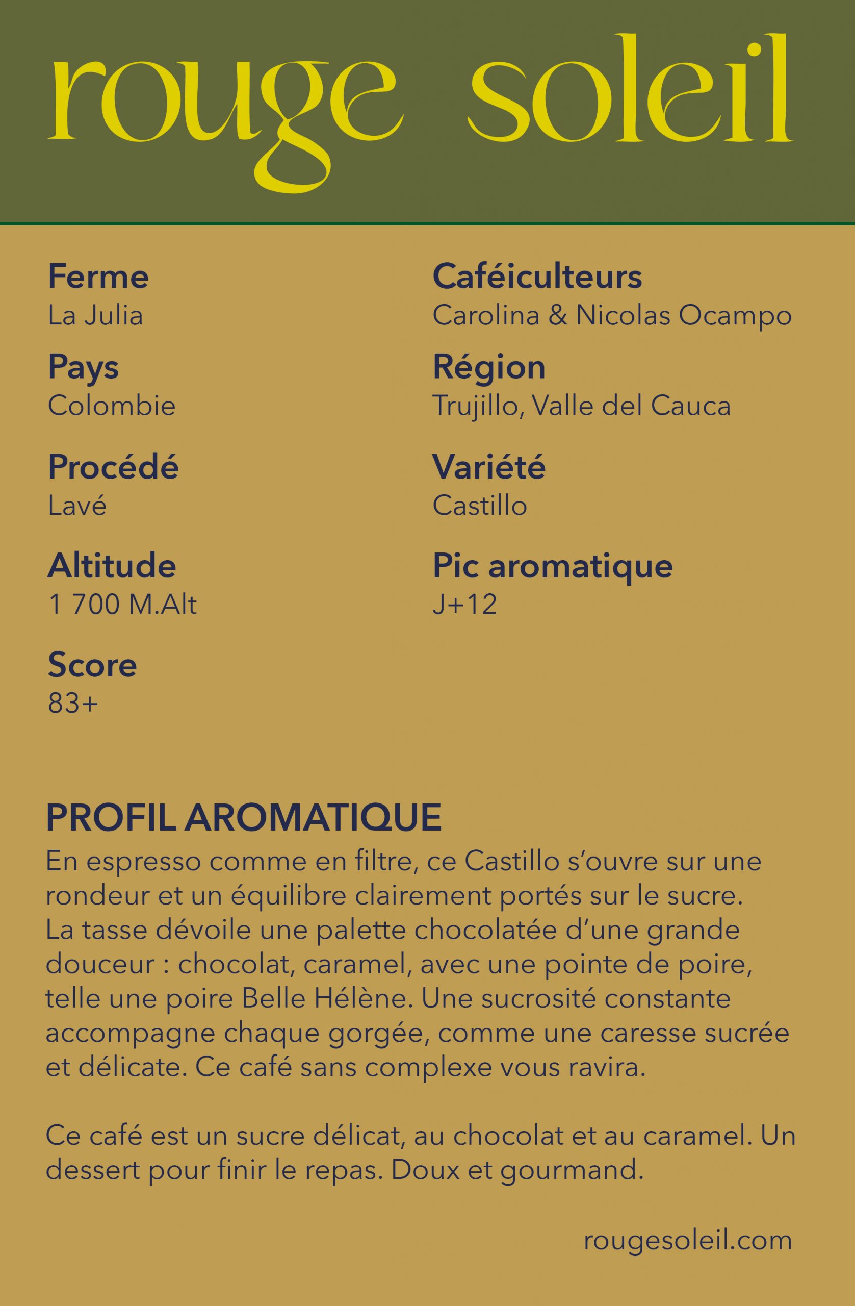En espresso comme en filtre, ce Castillo s’ouvre sur une rondeur et un équilibre clairement portés sur le sucre. La tasse dévoile une palette chocolatée d’une grande douceur : chocolat, caramel, avec une pointe de poire, telle une poire Belle Hélène. Une sucrosité constante accompagne chaque gorgée, comme une caresse sucrée et délicate. Ce café sans complexe vous ravira.